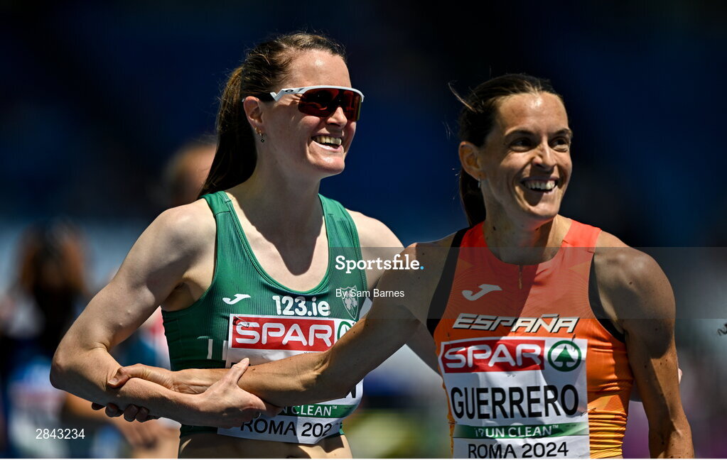 7 June 2024; Ciara Mageean of Ireland with Esther Guerrero of Spain, right, after finishing third in her women's 1500m heat during day one of the 2024 European Athletics Championships at the Stadio Olimpico in Rome, Italy. Photo by Sam Barnes/Sportsfile