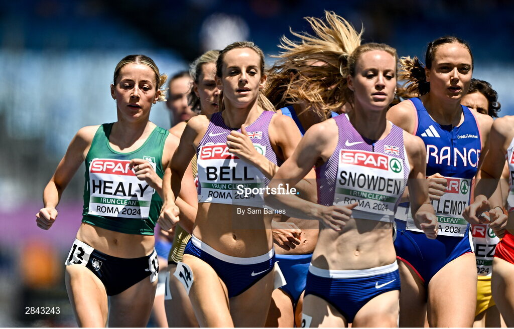 7 June 2024; Sarah Healy of Ireland, left, competes in the women's 1500m heat during day one of the 2024 European Athletics Championships at the Stadio Olimpico in Rome, Italy. Photo by Sam Barnes/Sportsfile