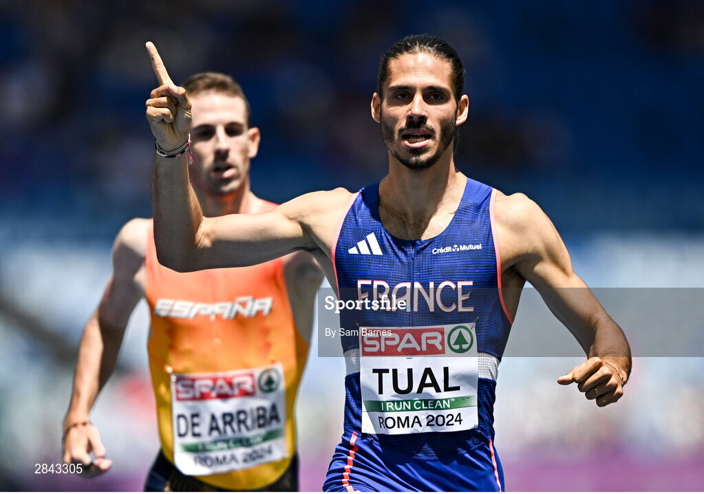 7 June 2024; Gabriel Tual of France celebrates after winning his Men's 800m heats during day one of the 2024 European Athletics Championships at the Stadio Olimpico in Rome, Italy. Photo by Sam Barnes/Sportsfile