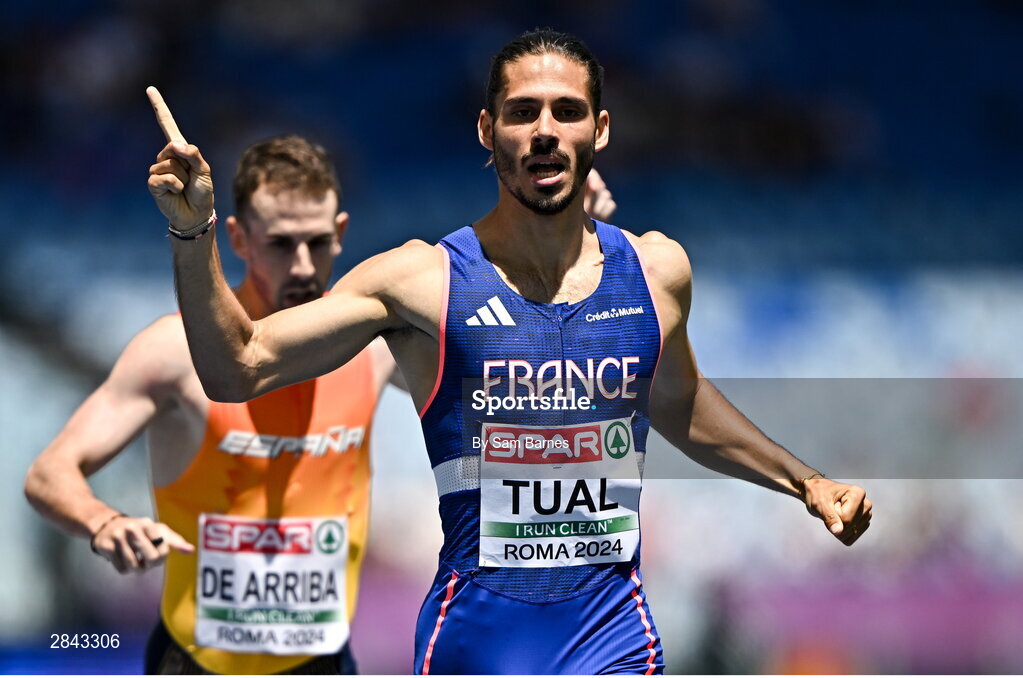 7 June 2024; Gabriel Tual of France celebrates after winning his Men's 800m heats during day one of the 2024 European Athletics Championships at the Stadio Olimpico in Rome, Italy. Photo by Sam Barnes/Sportsfile