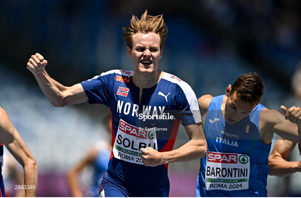 7 June 2024; Ole Jakob Solbu of Norway celebrates on his way to winning his Men's 800m heat during day one of the 2024 European Athletics Championships at the Stadio Olimpico in Rome, Italy. Photo by Sam Barnes/Sportsfile