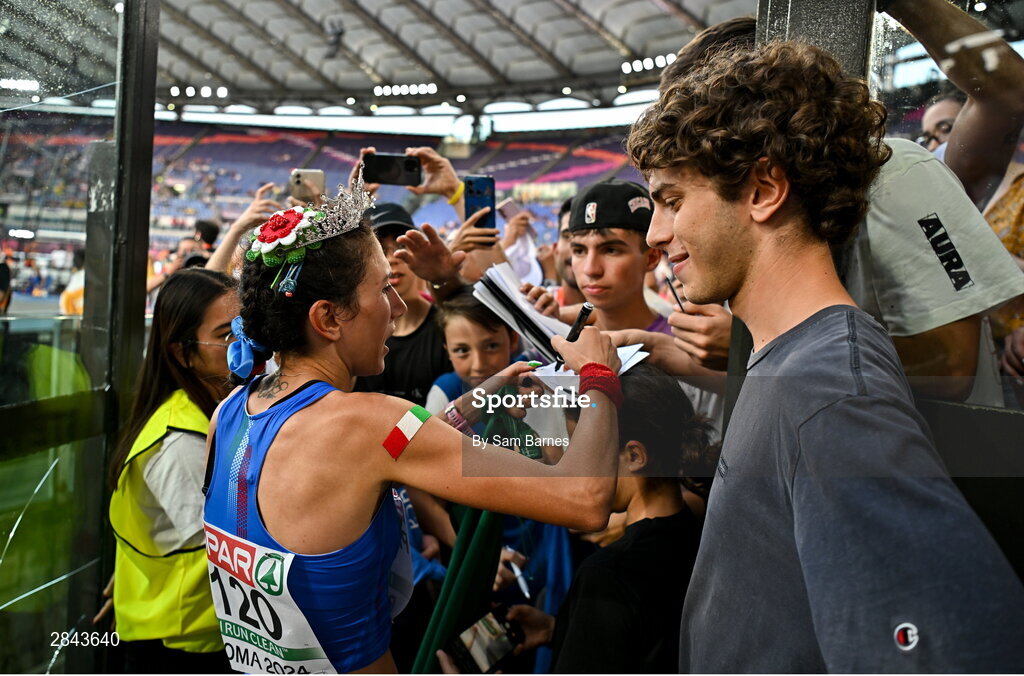 7 June 2024; Antonella Palmisano of Italy signs autographs for supporters after winning the Women's 20km Race Walk final during day one of the 2024 European Athletics Championships at the Stadio Olimpico in Rome, Italy. Photo by Sam Barnes/Sportsfile