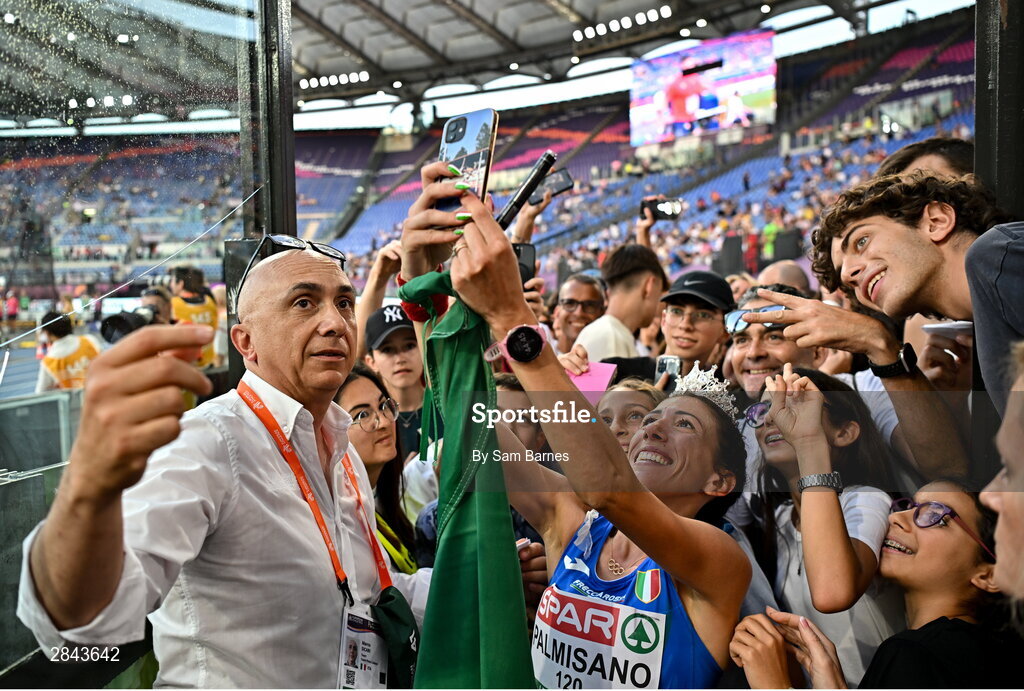 7 June 2024; Antonella Palmisano of Italy takes a selfie with supporters after winning the Women's 20km Race Walk final during day one of the 2024 European Athletics Championships at the Stadio Olimpico in Rome, Italy. Photo by Sam Barnes/Sportsfile