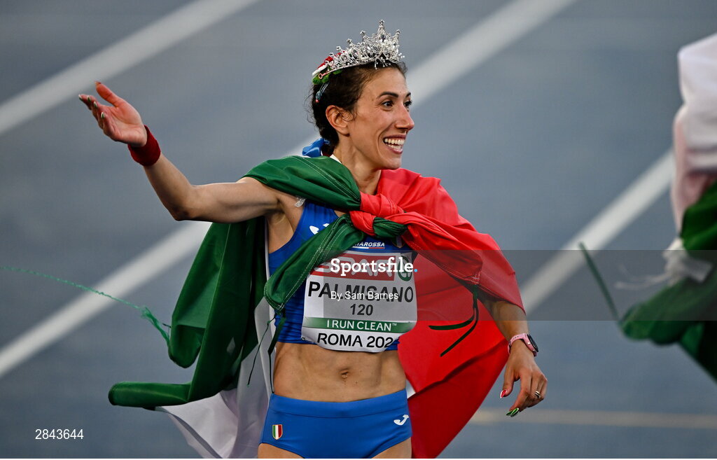 7 June 2024; Antonella Palmisano of Italy celebrates after winning the Women's 20km Race Walk final during day one of the 2024 European Athletics Championships at the Stadio Olimpico in Rome, Italy. Photo by Sam Barnes/Sportsfile