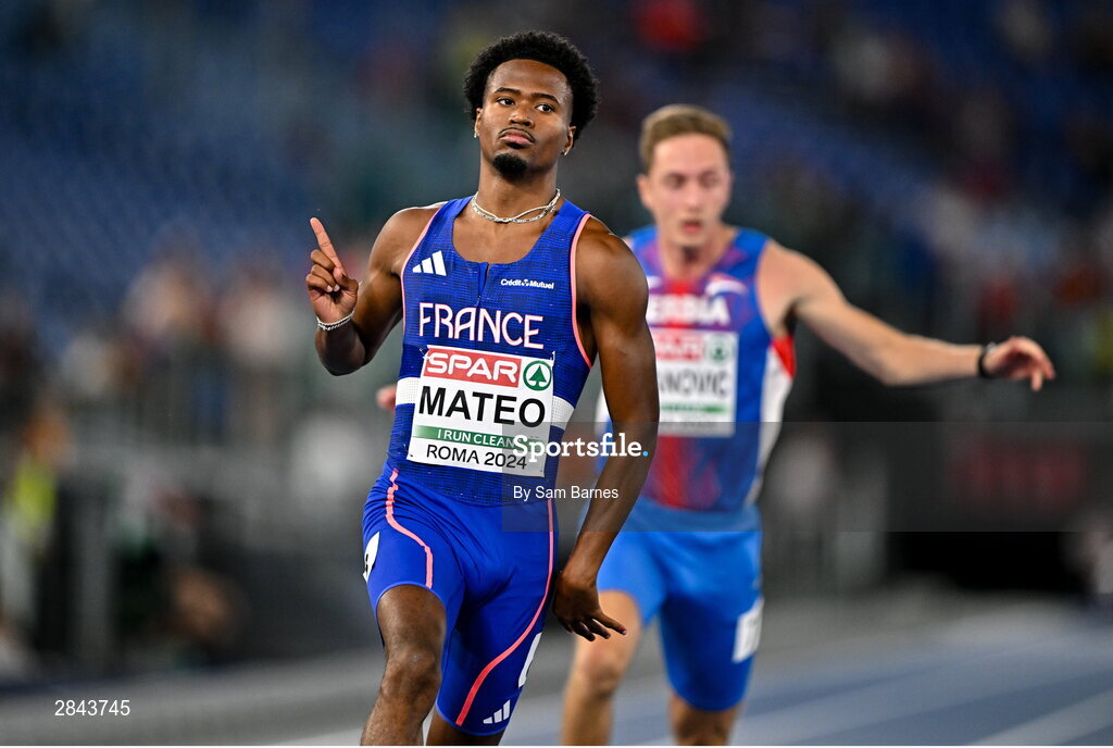 7 June 2024; Pablo Mateo of France celebrates after winning his Men's 100m heat during day one of the 2024 European Athletics Championships at the Stadio Olimpico in Rome, Italy. Photo by Sam Barnes/Sportsfile