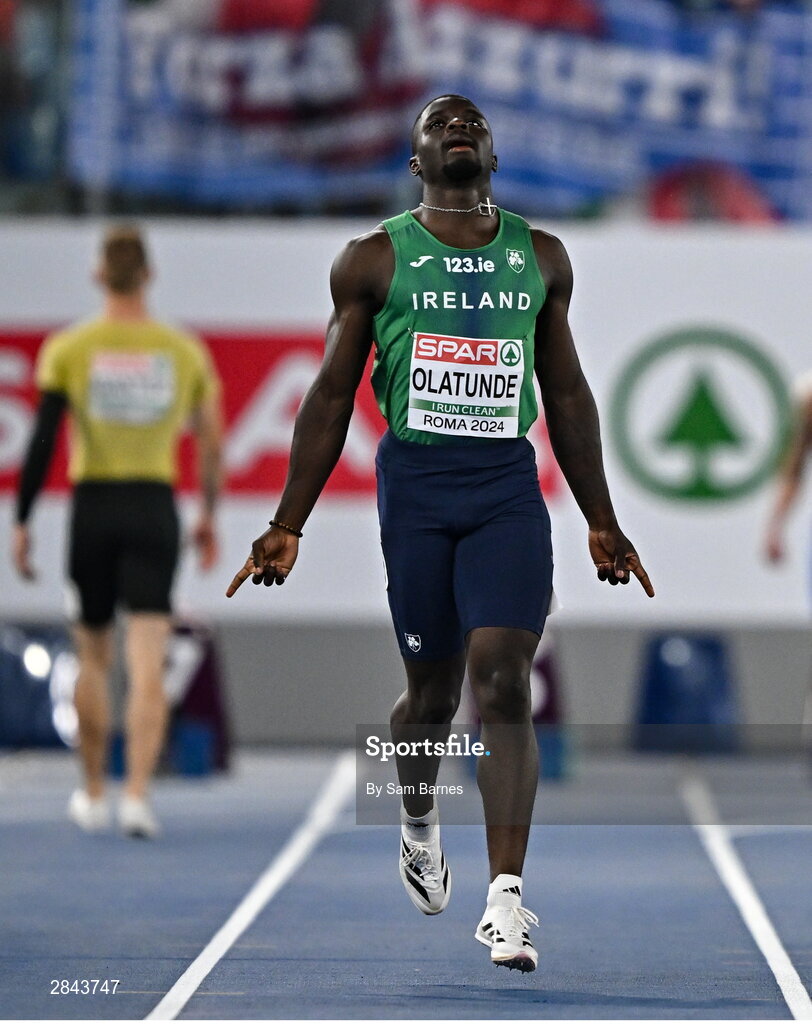 7 June 2024; Israel Olatunde of Ireland before competing in the men's 100m heats during day one of the 2024 European Athletics Championships at the Stadio Olimpico in Rome, Italy. Photo by Sam Barnes/Sportsfile
