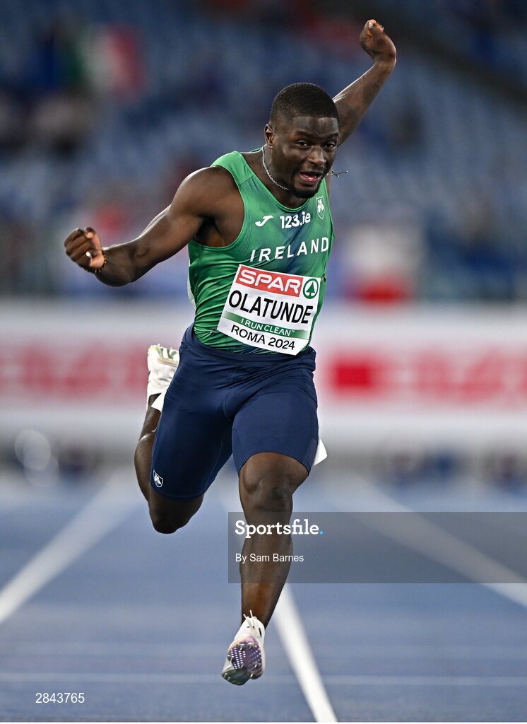 7 June 2024; Israel Olatunde of Ireland on his way to finishing third in his men's 100m heat during day one of the 2024 European Athletics Championships at the Stadio Olimpico in Rome, Italy. Photo by Sam Barnes/Sportsfile