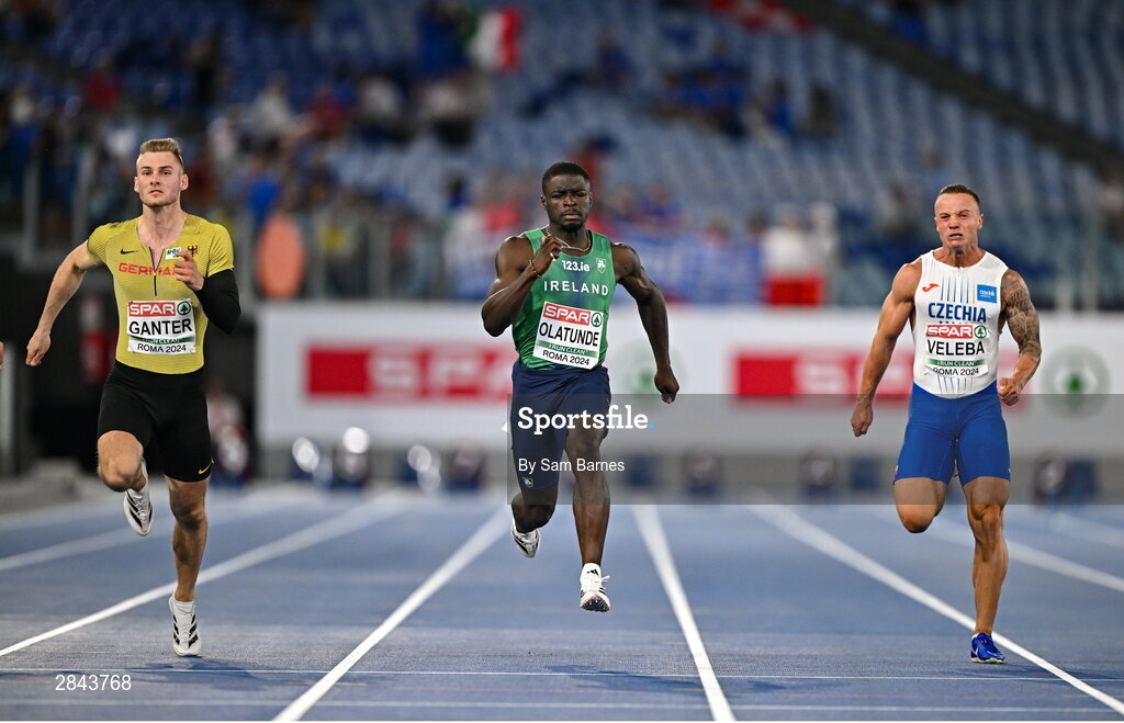 7 June 2024; Competitors, from left, Robin Ganter of Germany, Israel Olatunde of Ireland and Jan Veleba of Czech Republic compete in the men's 100m heats during day one of the 2024 European Athletics Championships at the Stadio Olimpico in Rome, Italy. Photo by Sam Barnes/Sportsfile