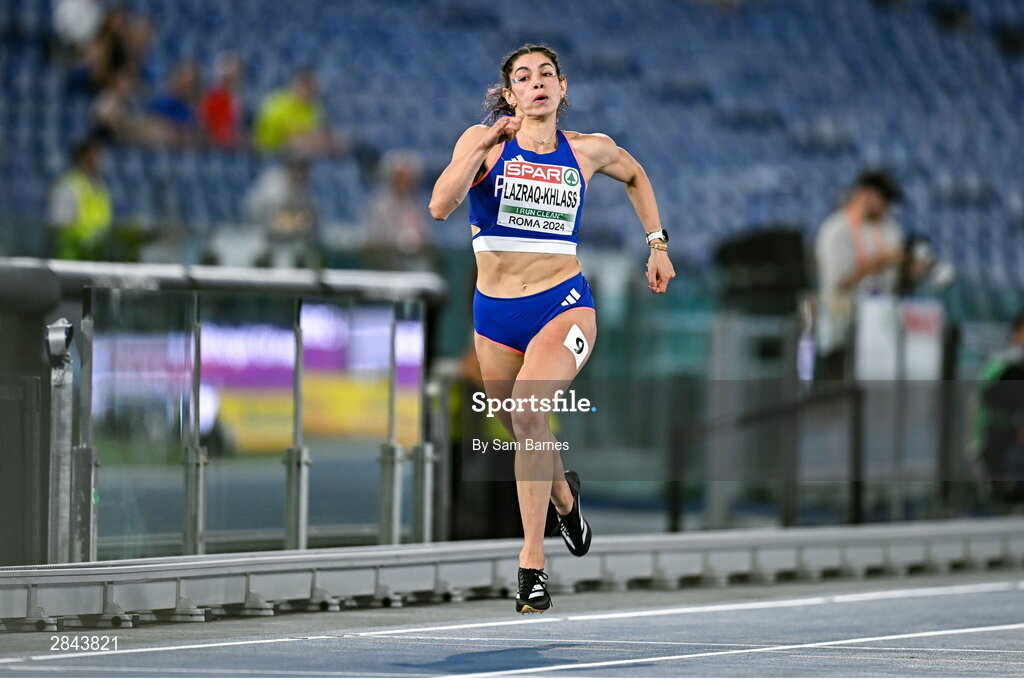 7 June 2024; Auriana Lazraq-Khlass of France on her way to finishing second in the Women's Heptathlon - 200m during day one of the 2024 European Athletics Championships at the Stadio Olimpico in Rome, Italy. Photo by Sam Barnes/Sportsfile
