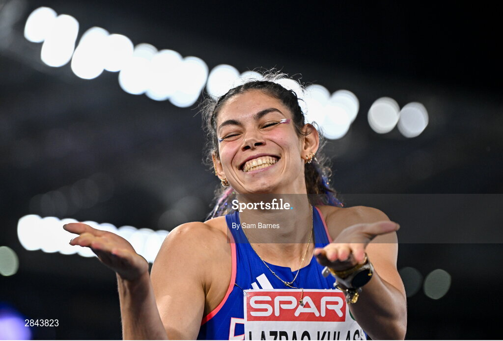 7 June 2024; Auriana Lazraq-Khlass of France celebrates after finishing second in the Women's Heptathlon - 200m during day one of the 2024 European Athletics Championships at the Stadio Olimpico in Rome, Italy. Photo by Sam Barnes/Sportsfile