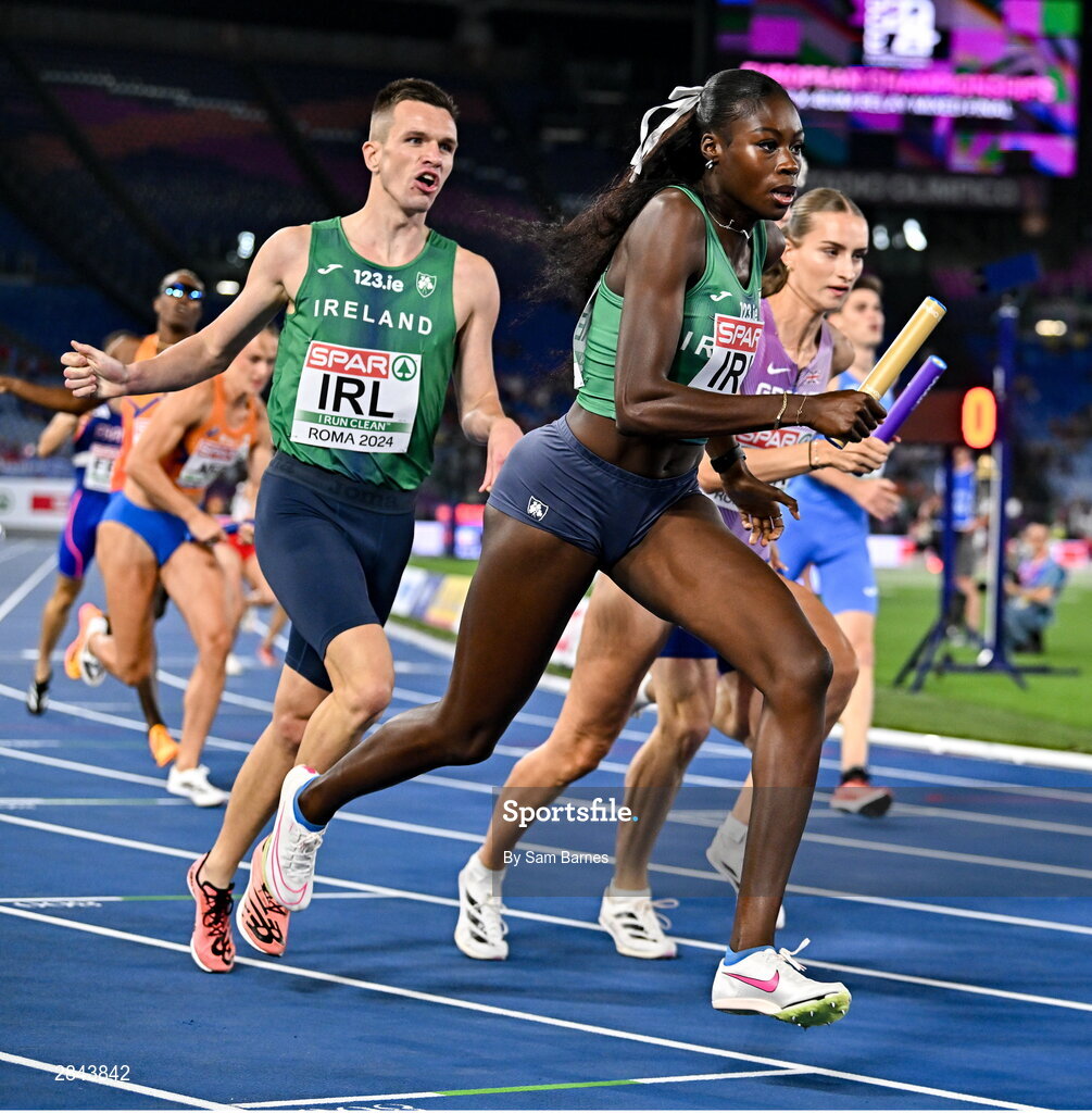 7 June 2024; Chris O'Donnell, left, passes the baton to Ireland teammate Rhasidat Adeleke in the Mixed 4x400m Relay final during day one of the 2024 European Athletics Championships at the Stadio Olimpico in Rome, Italy. Photo by Sam Barnes/Sportsfile