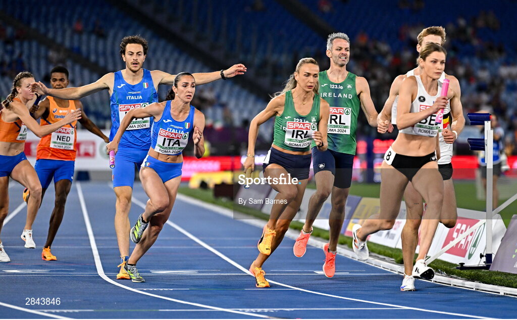 7 June 2024; Thomas Barr, right, passes the baton to Ireland teammate Sharlene Mawdsley in the Mixed 4x400m Relay final during day one of the 2024 European Athletics Championships at the Stadio Olimpico in Rome, Italy. Photo by Sam Barnes/Sportsfile