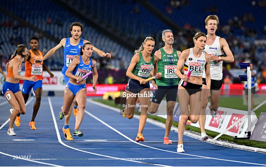 7 June 2024; Thomas Barr, right, passes the baton to Ireland teammate Sharlene Mawdsley in the Mixed 4x400m Relay final during day one of the 2024 European Athletics Championships at the Stadio Olimpico in Rome, Italy. Photo by Sam Barnes/Sportsfile