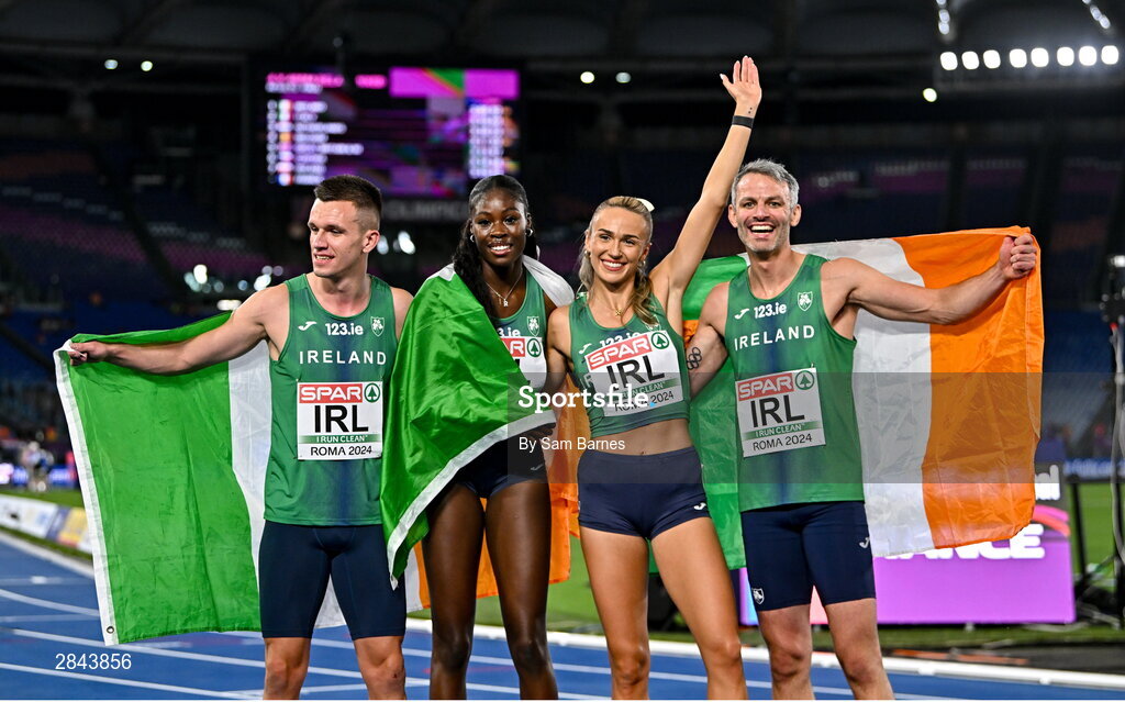 7 June 2024; Ireland 4x400m relay team, from left, Chris O'Donnell, Rhasidat Adeleke, Sharlene Mawdsley and Thomas Barr celebrate after winning the Mixed 4x400m Relay final during day one of the 2024 European Athletics Championships at the Stadio Olimpico in Rome, Italy. Photo by Sam Barnes/Sportsfile