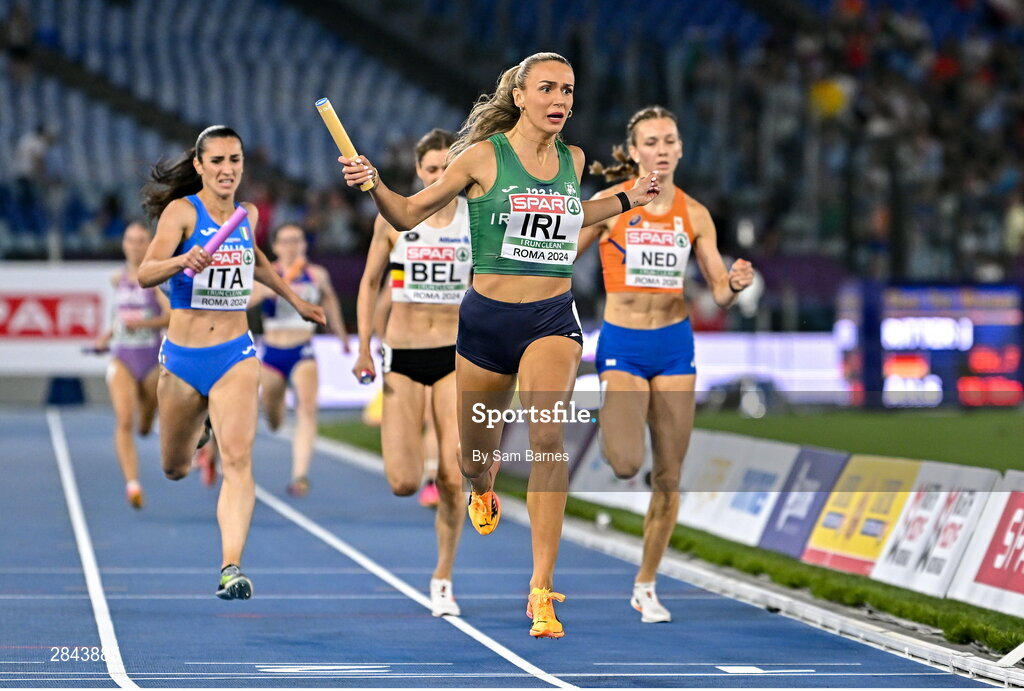 7 June 2024; Sharlene Mawdsley of Ireland on her way to winning the Mixed 4x400m Relay final during day one of the 2024 European Athletics Championships at the Stadio Olimpico in Rome, Italy. Photo by Sam Barnes/Sportsfile