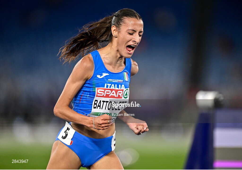 7 June 2024; Nadia Battocletti of Italy celebrates after winning the Women's 5000m final during day one of the 2024 European Athletics Championships at the Stadio Olimpico in Rome, Italy. Photo by Sam Barnes/Sportsfile