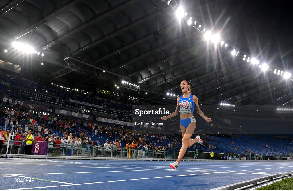 7 June 2024; Nadia Battocletti of Italy celebrates after winning the Women's 5000m final during day one of the 2024 European Athletics Championships at the Stadio Olimpico in Rome, Italy. Photo by Sam Barnes/Sportsfile