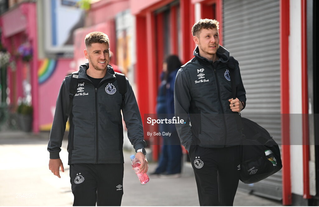 13 June 2024; Shamrock Rovers players Dylan Watts, left, and Markus Poom arrive before the SSE Airtricity Men's Premier Division match between St Patrick's Athletic and Shamrock Rovers at Richmond Park in Dublin. Photo by Seb Daly/Sportsfile