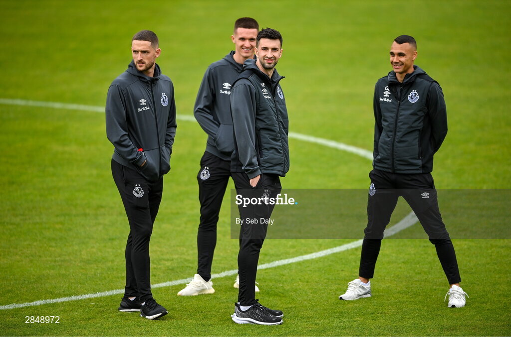 13 June 2024; Shamrock Rovers players, from left, Lee Grace, Johnny Kenny, Neil Farrugia and Graham Burke before the SSE Airtricity Men's Premier Division match between St Patrick's Athletic and Shamrock Rovers at Richmond Park in Dublin. Photo by Seb Daly/Sportsfile