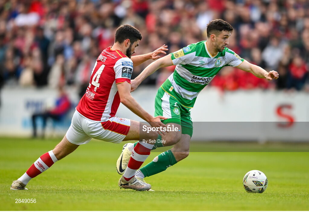 13 June 2024; Neil Farrugia of Shamrock Rovers in action against Luke Turner of St Patrick's Athletic during the SSE Airtricity Men's Premier Division match between St Patrick's Athletic and Shamrock Rovers at Richmond Park in Dublin. Photo by Seb Daly/Sportsfile