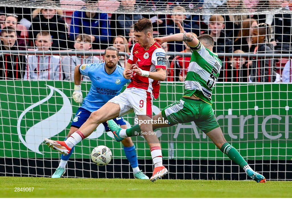 13 June 2024; Mason Melia of St Patrick's Athletic in action against Lee Grace of Shamrock Rovers during the SSE Airtricity Men's Premier Division match between St Patrick's Athletic and Shamrock Rovers at Richmond Park in Dublin. Photo by Seb Daly/Sportsfile