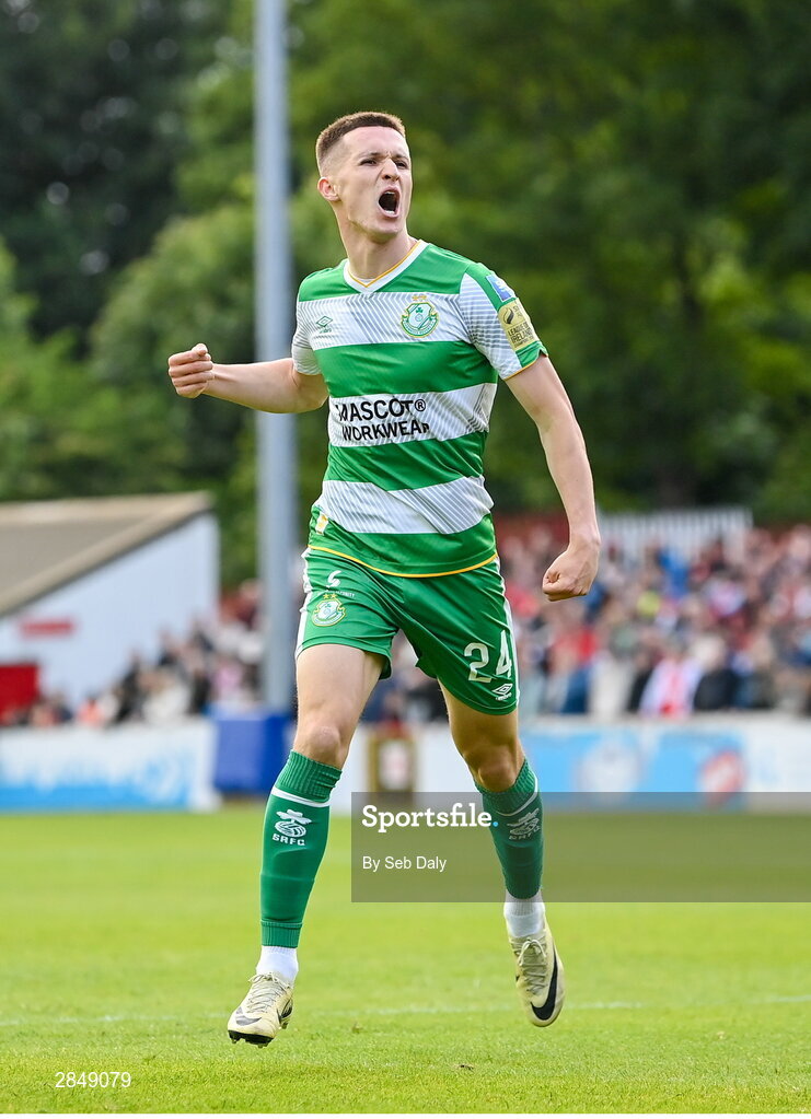 13 June 2024; Johnny Kenny of Shamrock Rovers celebrates after scoring his side's first goal during the SSE Airtricity Men's Premier Division match between St Patrick's Athletic and Shamrock Rovers at Richmond Park in Dublin. Photo by Seb Daly/Sportsfile