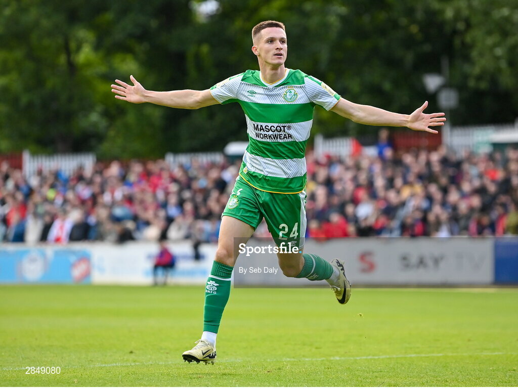 13 June 2024; Johnny Kenny of Shamrock Rovers celebrates after scoring his side's first goal during the SSE Airtricity Men's Premier Division match between St Patrick's Athletic and Shamrock Rovers at Richmond Park in Dublin. Photo by Seb Daly/Sportsfile