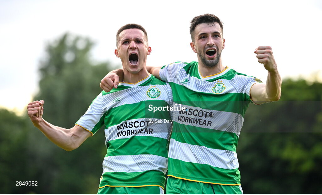 13 June 2024; Johnny Kenny of Shamrock Rovers, left, celebrates with teammate Neil Farrugia after scoring their side's first goal during the SSE Airtricity Men's Premier Division match between St Patrick's Athletic and Shamrock Rovers at Richmond Park in Dublin. Photo by Seb Daly/Sportsfile