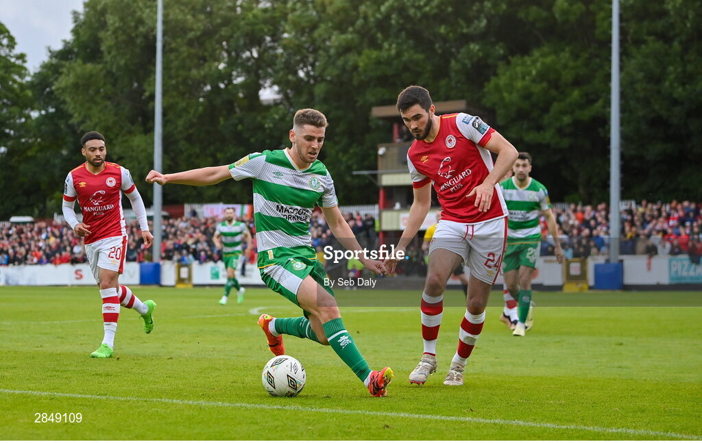13 June 2024; Dylan Watts of Shamrock Rovers in action against Luke Turner of St Patrick's Athletic during the SSE Airtricity Men's Premier Division match between St Patrick's Athletic and Shamrock Rovers at Richmond Park in Dublin. Photo by Seb Daly/Sportsfile