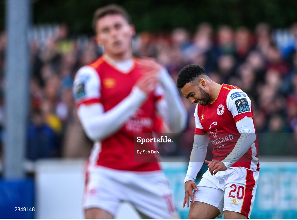 13 June 2024; Jake Mulraney of St Patrick's Athletic reacts during the SSE Airtricity Men's Premier Division match between St Patrick's Athletic and Shamrock Rovers at Richmond Park in Dublin. Photo by Seb Daly/Sportsfile