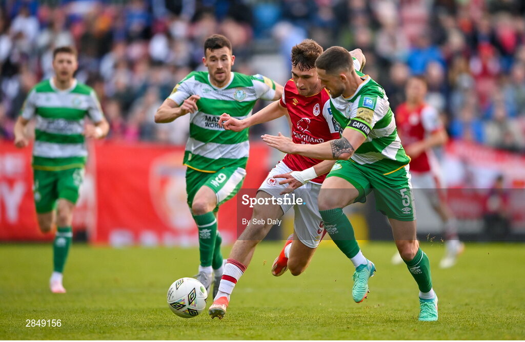 13 June 2024; Mason Melia of St Patrick's Athletic in action against Lee Grace of Shamrock Rovers during the SSE Airtricity Men's Premier Division match between St Patrick's Athletic and Shamrock Rovers at Richmond Park in Dublin. Photo by Seb Daly/Sportsfile