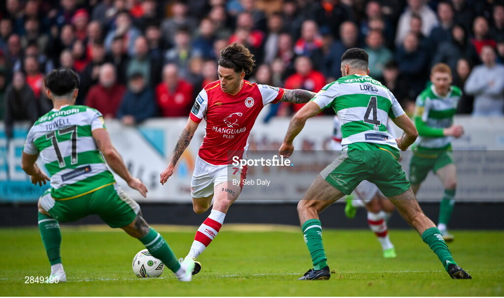 13 June 2024; Ruairi Keating of St Patrick's Athletic scores his side's first goal during the SSE Airtricity Men's Premier Division match between St Patrick's Athletic and Shamrock Rovers at Richmond Park in Dublin. Photo by Seb Daly/Sportsfile