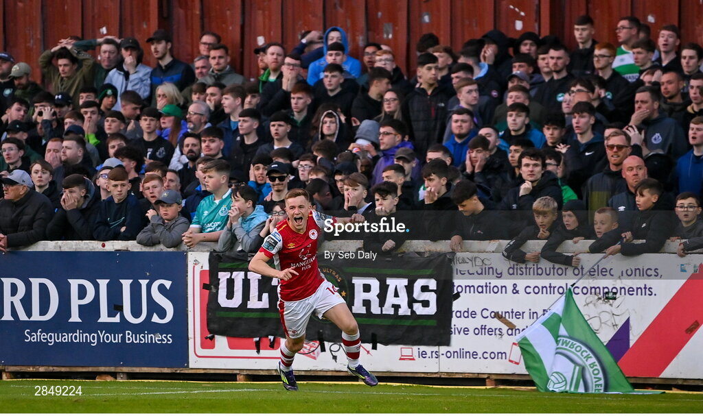 13 June 2024; Brandon Kavanagh of St Patrick's Athletic celebrates after scoring his side's second goal during the SSE Airtricity Men's Premier Division match between St Patrick's Athletic and Shamrock Rovers at Richmond Park in Dublin. Photo by Seb Daly/Sportsfile