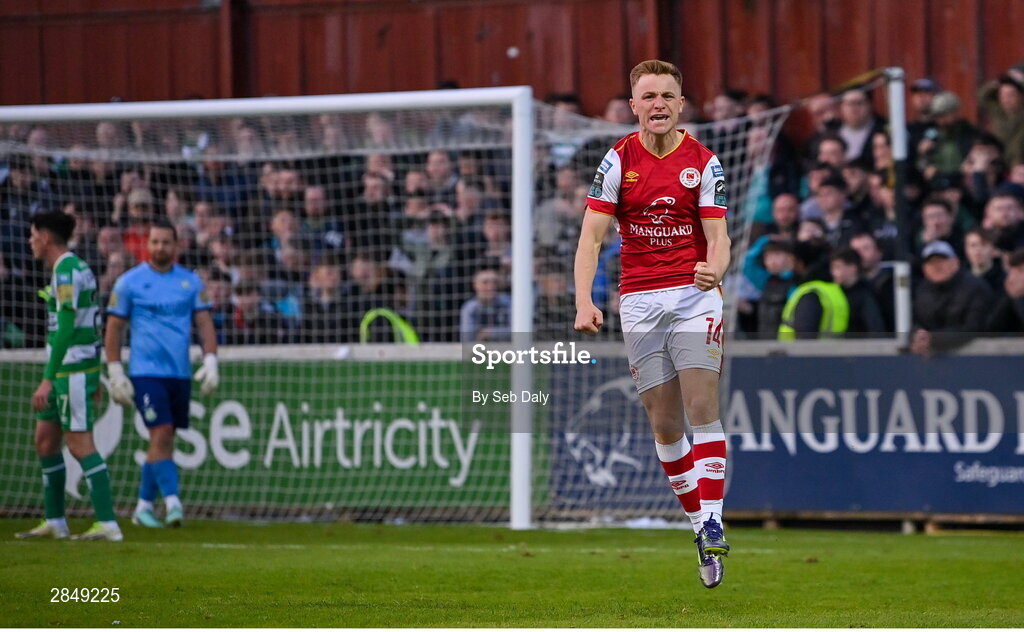 13 June 2024; Brandon Kavanagh of St Patrick's Athletic celebrates after scoring his side's second goal during the SSE Airtricity Men's Premier Division match between St Patrick's Athletic and Shamrock Rovers at Richmond Park in Dublin. Photo by Seb Daly/Sportsfile