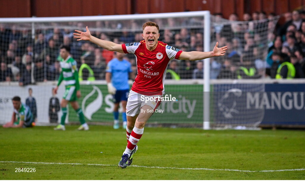 13 June 2024; Brandon Kavanagh of St Patrick's Athletic celebrates after scoring his side's second goal during the SSE Airtricity Men's Premier Division match between St Patrick's Athletic and Shamrock Rovers at Richmond Park in Dublin. Photo by Seb Daly/Sportsfile