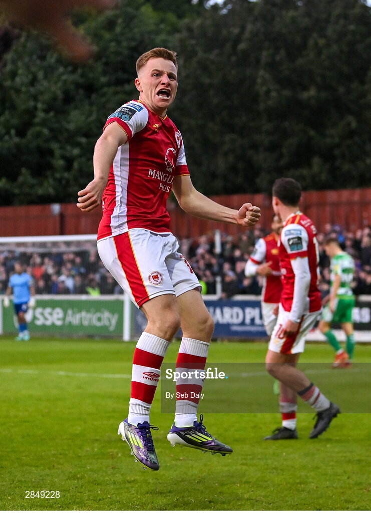 13 June 2024; Brandon Kavanagh of St Patrick's Athletic celebrates after scoring his side's second goal during the SSE Airtricity Men's Premier Division match between St Patrick's Athletic and Shamrock Rovers at Richmond Park in Dublin. Photo by Seb Daly/Sportsfile