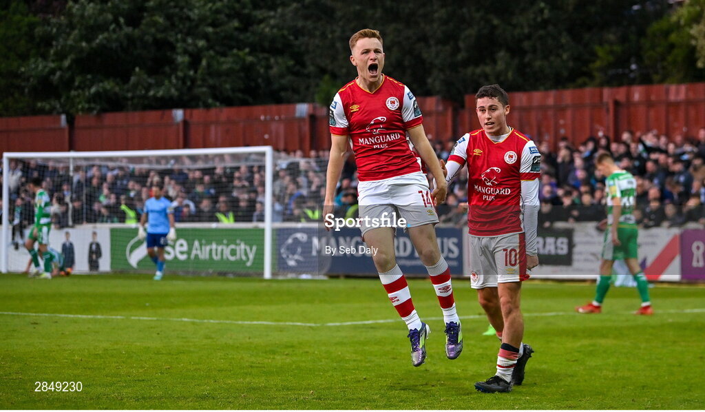 13 June 2024; Brandon Kavanagh of St Patrick's Athletic, left, celebrates after scoring his side's second goal during the SSE Airtricity Men's Premier Division match between St Patrick's Athletic and Shamrock Rovers at Richmond Park in Dublin. Photo by Seb Daly/Sportsfile