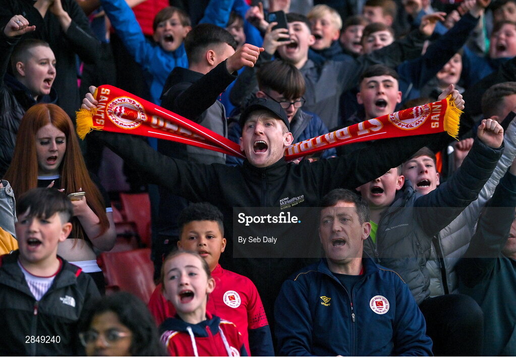 13 June 2024; St Patrick's Athletic supporters after their side's victory in the SSE Airtricity Men's Premier Division match between St Patrick's Athletic and Shamrock Rovers at Richmond Park in Dublin. Photo by Seb Daly/Sportsfile