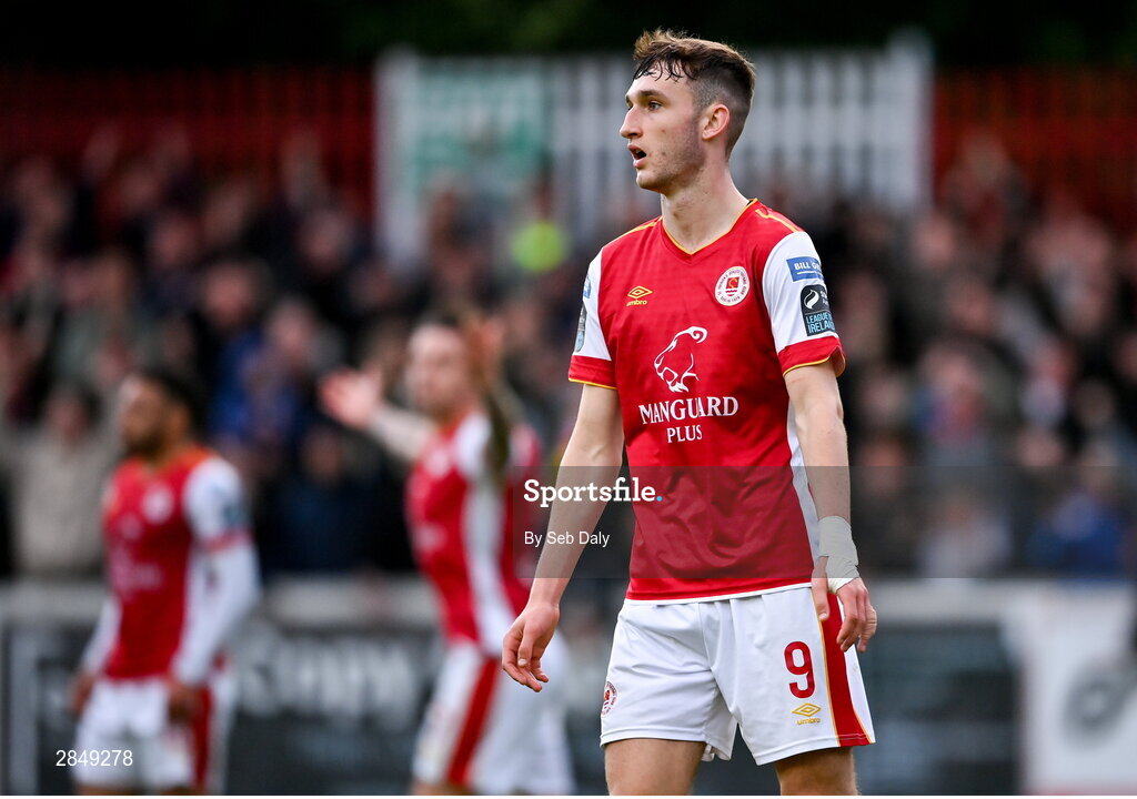 13 June 2024; Mason Melia of St Patrick's Athletic during the SSE Airtricity Men's Premier Division match between St Patrick's Athletic and Shamrock Rovers at Richmond Park in Dublin. Photo by Seb Daly/Sportsfile
