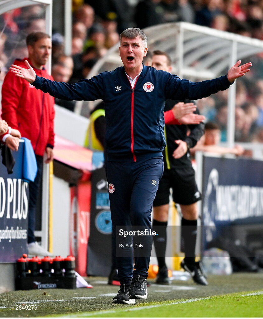13 June 2024; St Patrick's Athletic manager Stephen Kenny reacts during the SSE Airtricity Men's Premier Division match between St Patrick's Athletic and Shamrock Rovers at Richmond Park in Dublin. Photo by Seb Daly/Sportsfile