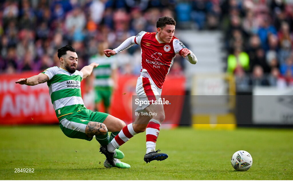 13 June 2024; Kian Leavy of St Patrick's Athletic in action against Richie Towell of Shamrock Rovers during the SSE Airtricity Men's Premier Division match between St Patrick's Athletic and Shamrock Rovers at Richmond Park in Dublin. Photo by Seb Daly/Sportsfile