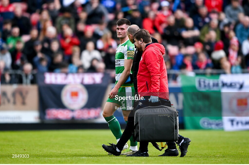 13 June 2024; Josh Honohan of Shamrock Rovers leaves the pitch with medical staff to receive treatment during the SSE Airtricity Men's Premier Division match between St Patrick's Athletic and Shamrock Rovers at Richmond Park in Dublin. Photo by Seb Daly/Sportsfile