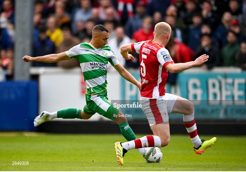 13 June 2024; Graham Burke of Shamrock Rovers in action against Tom Grivosti of St Patrick's Athletic during the SSE Airtricity Men's Premier Division match between St Patrick's Athletic and Shamrock Rovers at Richmond Park in Dublin. Photo by Seb Daly/Sportsfile