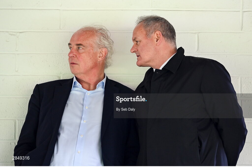 13 June 2024; St Patrick's Athletic chairman Garrett Kelleher, left, and technical director Alan Mathews before the SSE Airtricity Men's Premier Division match between St Patrick's Athletic and Shamrock Rovers at Richmond Park in Dublin. Photo by Seb Daly/Sportsfile