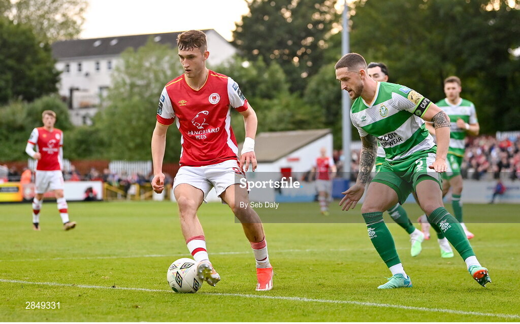 13 June 2024; Mason Melia of St Patrick's Athletic in action against Lee Grace of Shamrock Rovers during the SSE Airtricity Men's Premier Division match between St Patrick's Athletic and Shamrock Rovers at Richmond Park in Dublin. Photo by Seb Daly/Sportsfile