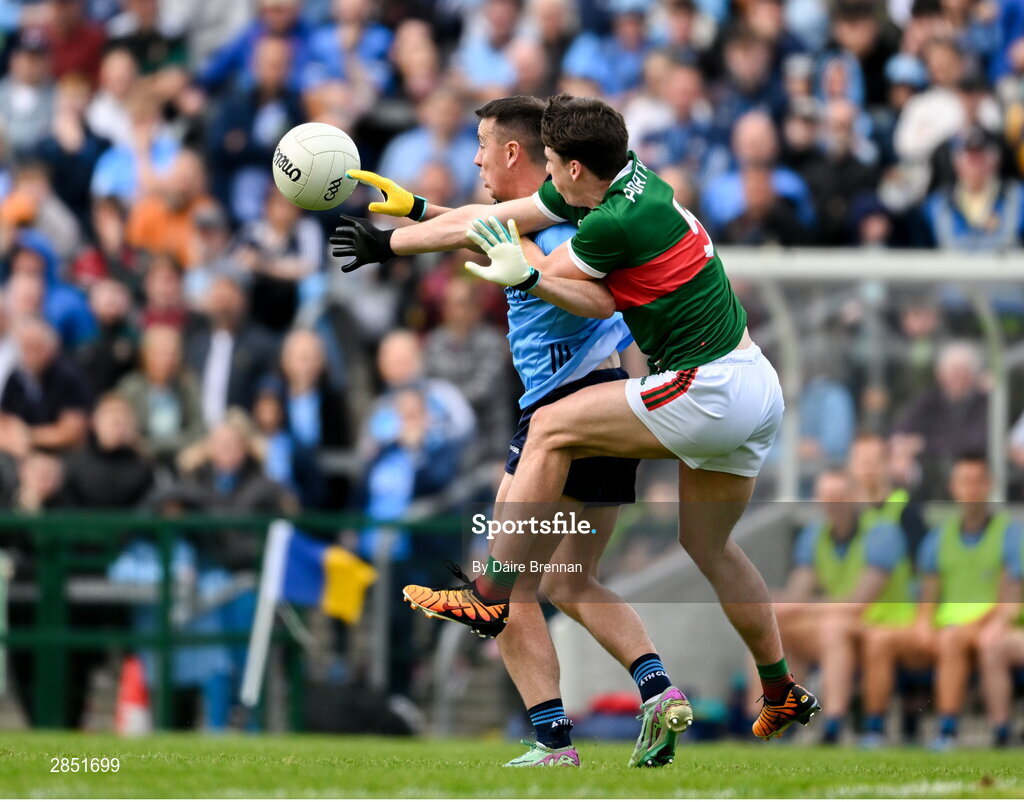 16 June 2024; Cormac Costello of Dublin in action against Sam Callinan of Mayo during the GAA Football All-Ireland Senior Championship Round 3 match between Dublin and Mayo at Dr Hyde Park in Roscommon. Photo by Daire Brennan/Sportsfile