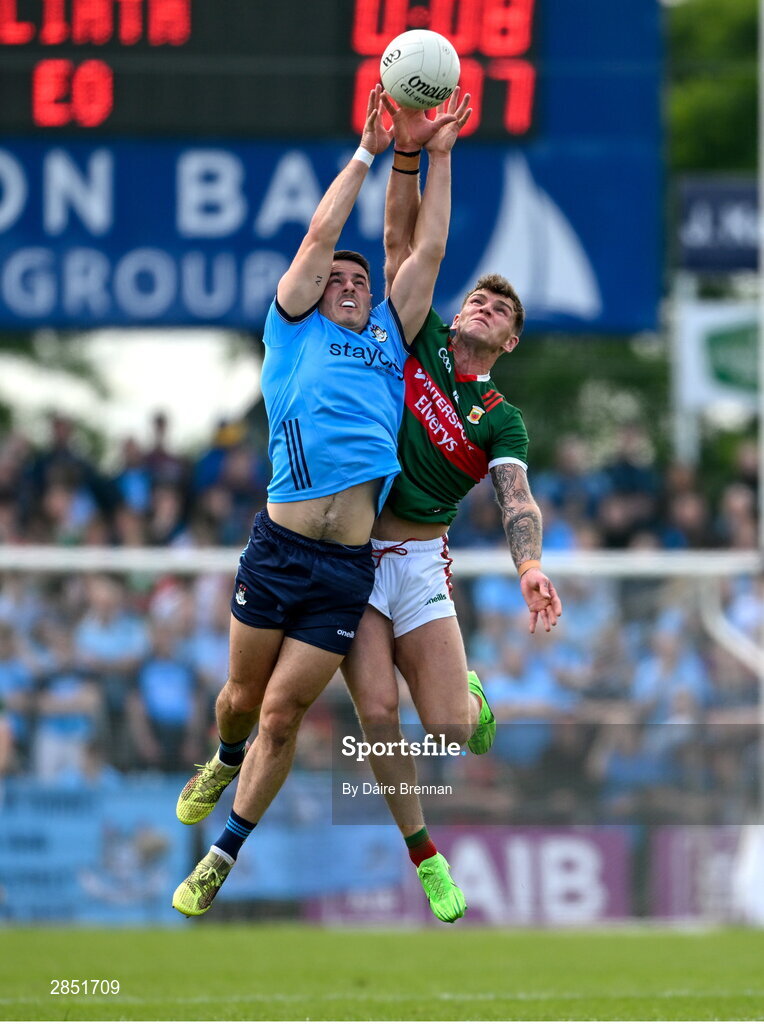 16 June 2024; Brian Howard of Dublin in action against Jordan Flynn of Mayo during the GAA Football All-Ireland Senior Championship Round 3 match between Dublin and Mayo at Dr Hyde Park in Roscommon. Photo by Daire Brennan/Sportsfile