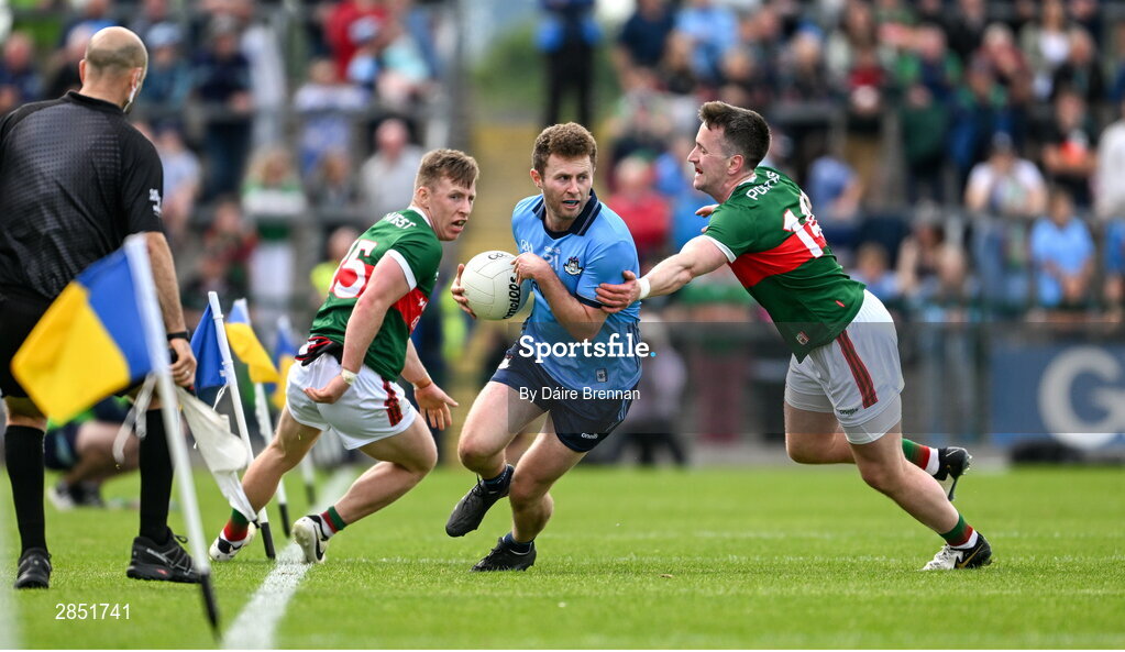 16 June 2024; Jack McCaffrey of Dublin in action against Cillian O’Connor of Mayo during the GAA Football All-Ireland Senior Championship Round 3 match between Dublin and Mayo at Dr Hyde Park in Roscommon. Photo by Daire Brennan/Sportsfile
