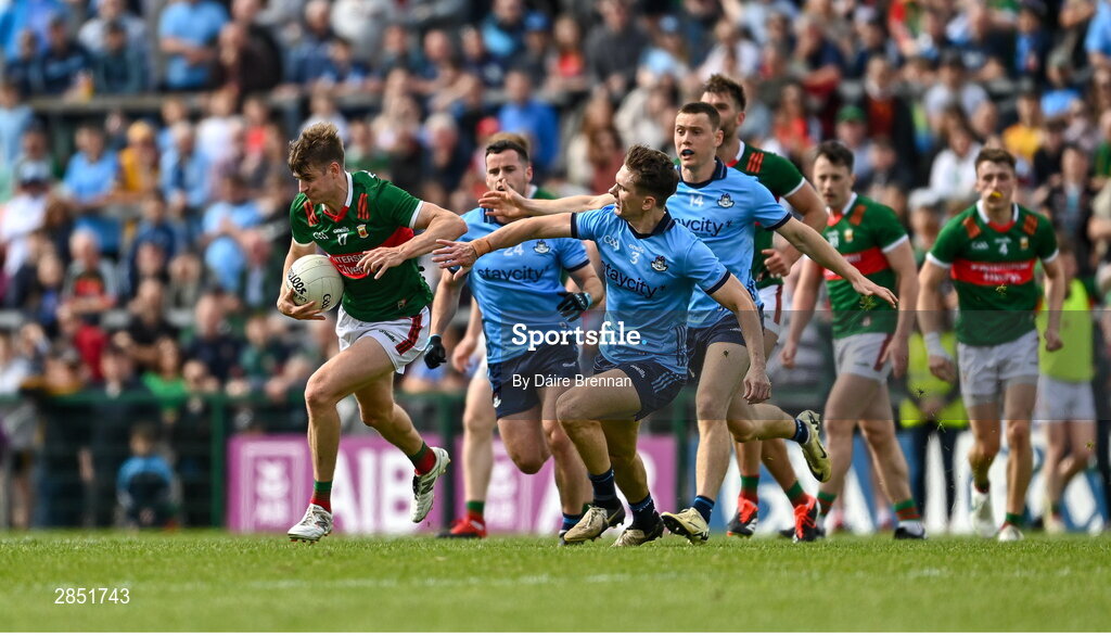 16 June 2024; Rory Brickenden of Mayo in action against Michael Fitzsimons of Dublin during the GAA Football All-Ireland Senior Championship Round 3 match between Dublin and Mayo at Dr Hyde Park in Roscommon. Photo by Daire Brennan/Sportsfile