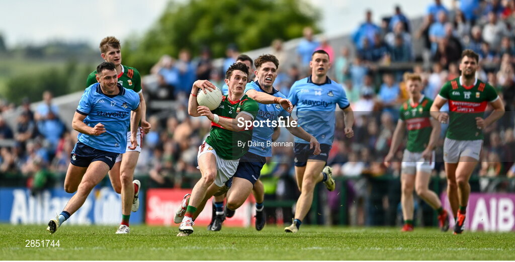 16 June 2024; Jack Coyne of Mayo in action against Michael Fitzsimons of Dublin during the GAA Football All-Ireland Senior Championship Round 3 match between Dublin and Mayo at Dr Hyde Park in Roscommon. Photo by Daire Brennan/Sportsfile